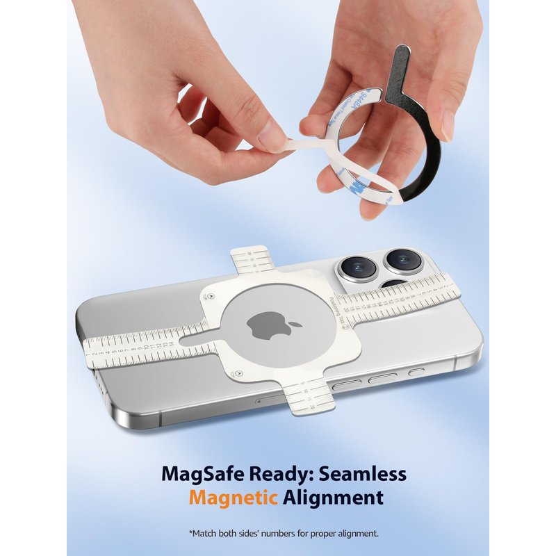 - [PRECISION INSTALLATION MADE EASY] Aligning is effortless with the included locator tool—when the numbers on both ends match, your Mag Safe ring is perfectly positioned. Designed for application on the OUTSIDE OF YOUR PHONE CASE ONLY, ensuring the strongest magnetic connection and optimal performance.