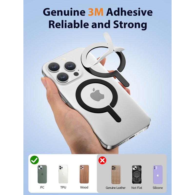 - [PREMIUM MATERIALS] Built with durable aluminum alloy and stainless steel for a sleek, lightweight finish. Strong for 3M adhesive ensures a secure hold without residue or device damage, while the thin profile maintains a natural grip.