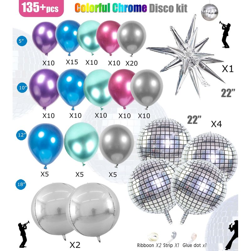 - Disco Balloon Kit: Includes 135 metallic balloons in chrome blue red purple silver colors for 80s 90s themed parties