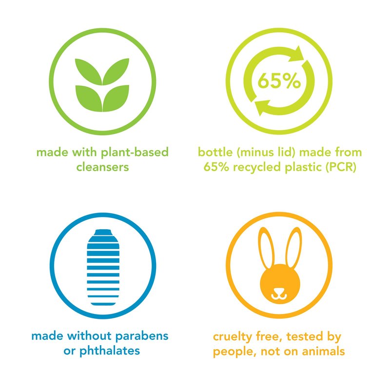- Bottle (minus lid) made of 65% recycled plastic (PCR).