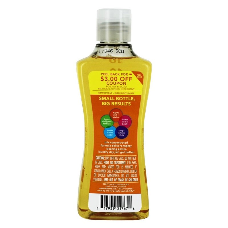 10 loads Naturally derived. Cleaning power. 3-in-1 Cleaning Power: powerful stain lifter; fragrance that lasts. HE for all washers. Made by and for people against dirty. methodhome.com. For more details go to methodhome.com/ingredients. Certified B Corporation. We're certified to benefit our people + the planet. Bottle made from 100% recycled plastic (PCR). Recycle for good karma. Never tested on animals. Made in USA.