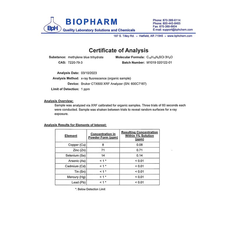 Biopharm Methylene Blue 1% USP Grade solution is made in the USA. Sourced from ultra-pure USP grade methylene blue, Biopharm has performed in-house testing and has obtained 3rd party testing by an analytical laboratory to ensure the highest purity available. Formaldehyde-free. Do not exceed recommended dose. Pregnant or nursing mothers, children under the age of 18, and individuals with a known medical condition should consult a physician before using this or any dietary supplement. Keep out of reach of children. Do not use if safety seal is damaged or missing. Store in a cool, dry place. *: These statements have not been evaluated by the food and drug administration. This product is not intended to diagnose, treat, cure or prevent any disease. 1% (w/v) solution = 1 g methylene blue per 100 mL of solution. 1000 mg per 100 mL, or 10 mg/mL. 20 drops per mL. 0.5 mg per drop.