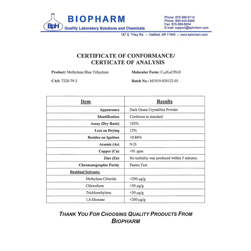 - Ultra-Pure USP Grade Formaldehyde Free Methylene Blue