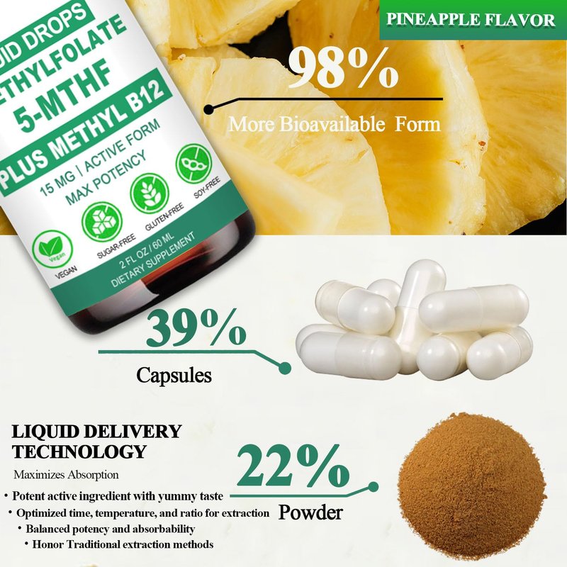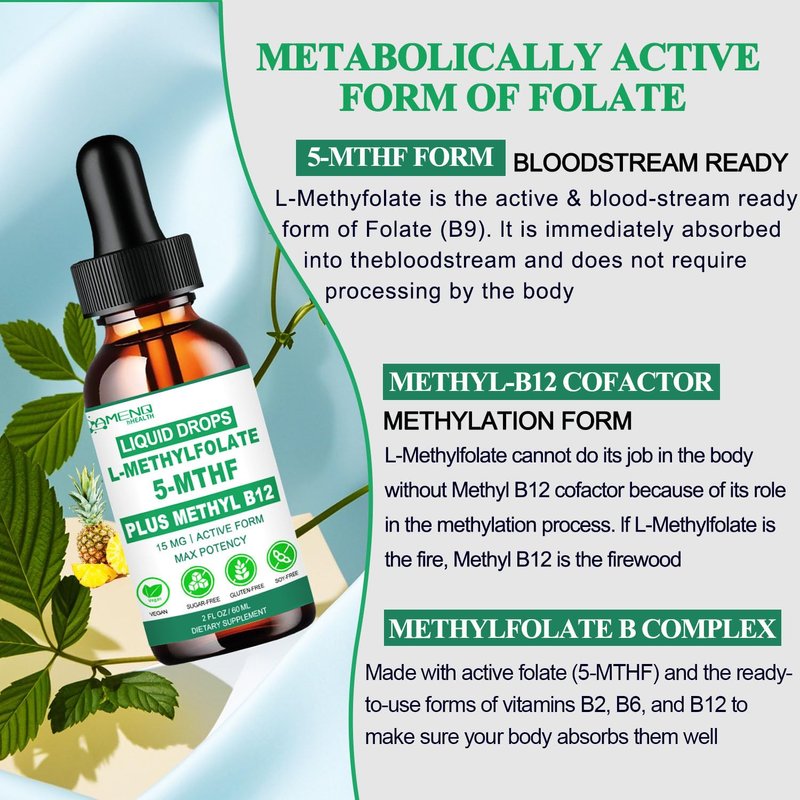 Methylfolate Supplement Liquid Drops, L Methy Folate 15mg Plus Methy B12, B6, B2 Multivitamin, Metabolically Active 5-MTHF Form for Mood Homocysteine Methylation Cognition Energy Nerve Health*