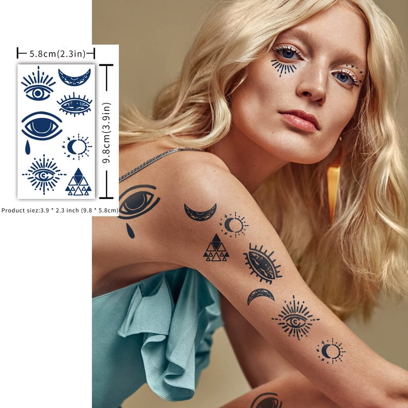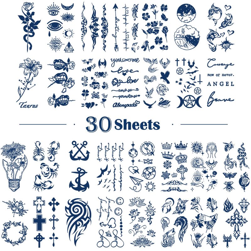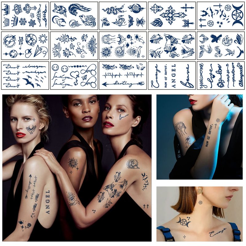 - [Realistic] The color and effect of semi-permanent tattoo stickers are very close to real tattoos. The Ink will sink into the top layer of your skin and develop into a dark blue color in 24 hours.It is very realistic! You can stick it on the arms, back of hands, fingers, big feet, leg, collarbone, neck, chest, etc.