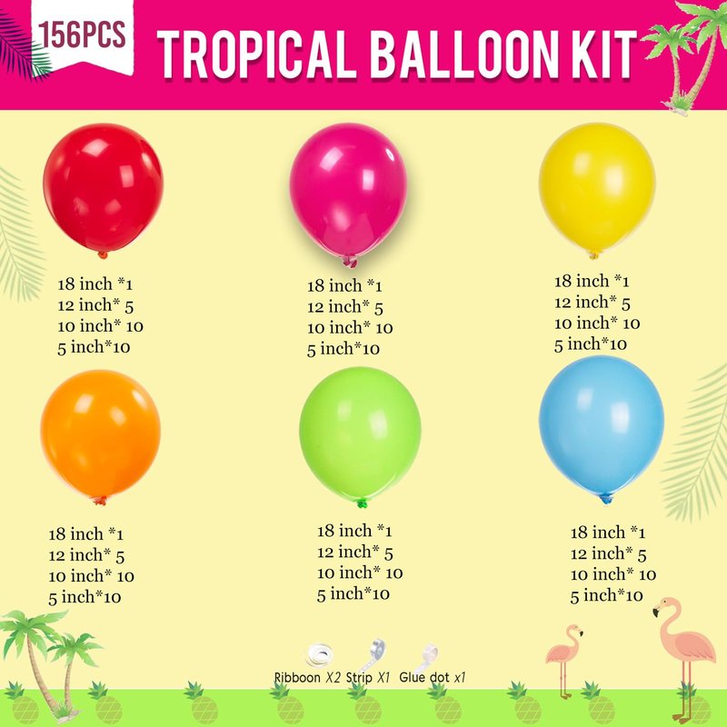 - 【Tropical Balloon Decorations】Includes the following 156 balloons in different sizes of 5/10/12/18 inches. We choose rich tropical color rubber balloons as the theme palette, add (glue dots/plastic arches/ribbons) tools, allowing you to create a cheerful and vibrant atmosphere, suitable for any theme party in summer.
