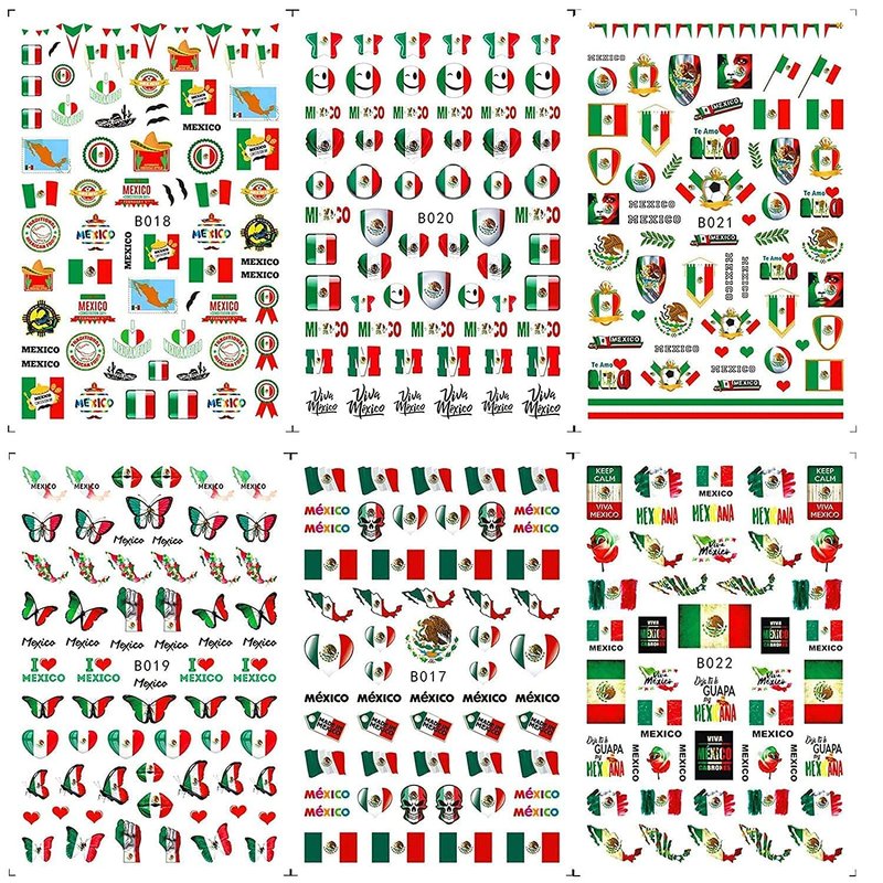 - Package Included: You will get 6 sheets of Mexican flag nail stickers, including Mexico flag, lips, heart, flame, stars, numbers, butterflies, etc. The size of each nail sticker is 3.9 x 3.1 inches