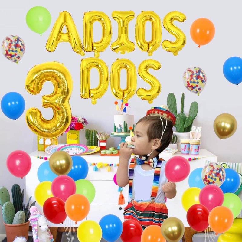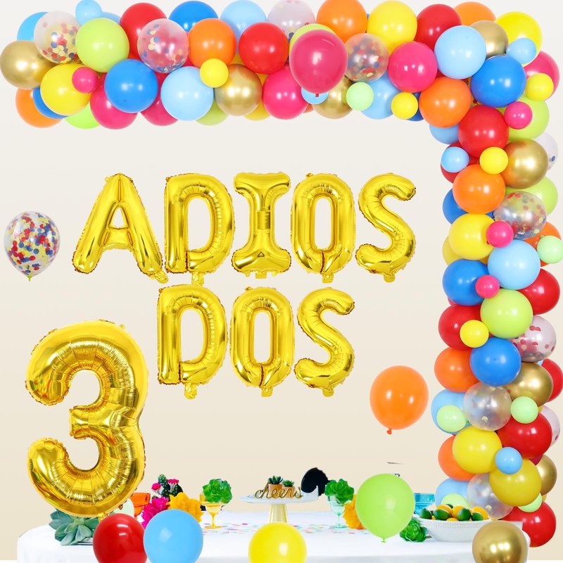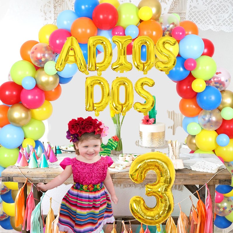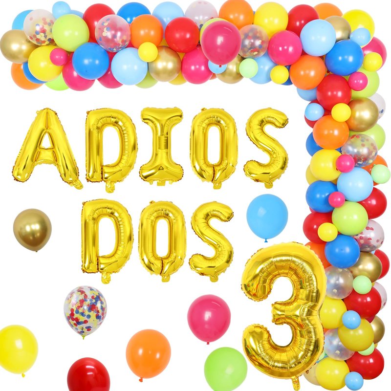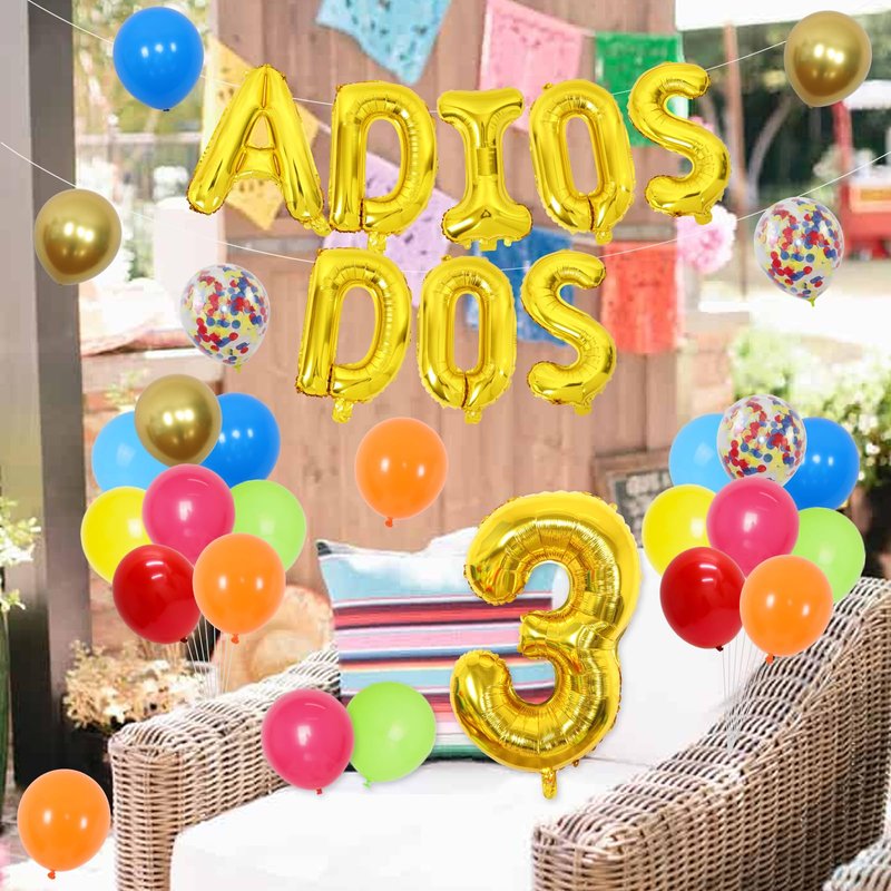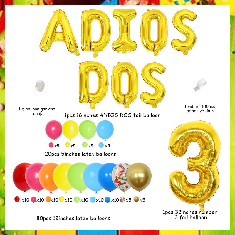 Party Decoration Includes: 80pcs 12inches latex balloons(10pcs rose red, 10pcs orange, 10pcs yellow, 10pcs red, 10pcs fruit green, 10pcs light blue, 10pcs royal blue, 5pcs metal golden, 5pcs clear with confetti) 20pcs 5inches latex balloons(5pcs rose red, 5pcs yellow, 5pcs fruit green, 5pcs light blue) 1pcs 16inches ADIOS DOS foil balloon 1pcs 32inches number 3 foil balloon 1pcs 28 x 25inches cactus foil balloon 1pcs 36 x 21inches pinata foil balloon 1 x balloon garland strip 1 roll of 100pcs adhesive dots