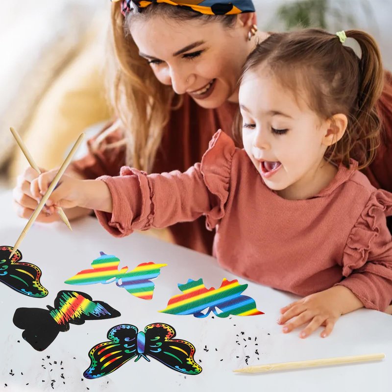 - Stimulate Children's Creativity: These rainbow scratch art are simple and interesting, it's a good way for kids to think and have fun. The magic art set is ideal for kids' games, school activities, butterfly party favor, class parties, and parent-child campaigns.