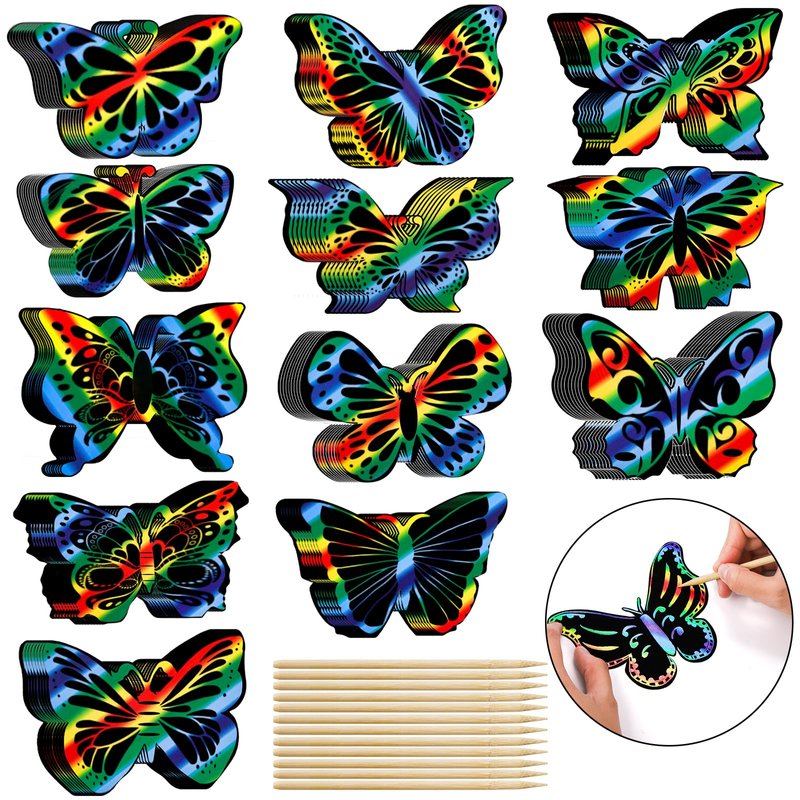 - Package Includes: 120 pcs butterfly scratch art with 12 pcs bamboo sticks. Come in 12 different sizes and shapes, 10 pcs for each size, allowing you to spend an enjoyable DIY day with your friends!