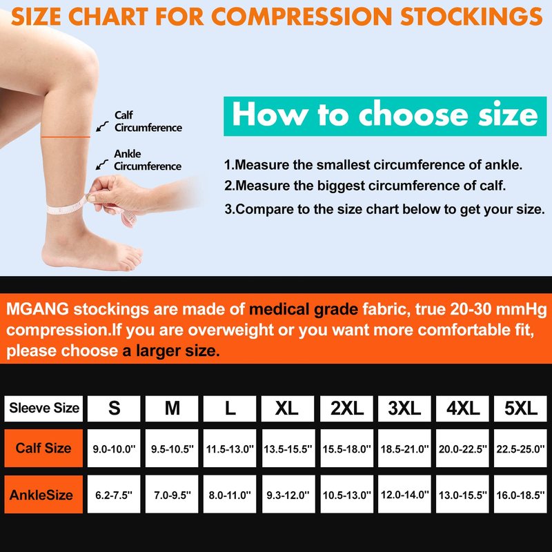 - ✅【OPTIMAL SUPPORT & FAST RECOVERY 】- These high quality unisex 20-30 mmHg compression knee high socks from MGANG are comfortable for women to wear without being too tight, and for men to make you train harder, recover faster and feel stronger. Wear these medical compression stockings for a few hours a day and you'll notice the difference in the way your legs feel. Offering durability in multiple sizes, they are ideal for daily compression support.