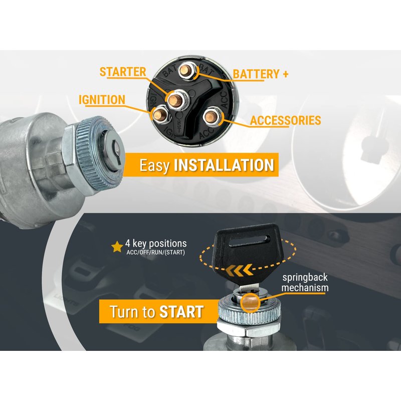 MGI SpeedWare 4-Position Universal Ignition Key Switch for 12V Car, Truck, Tractor, Trailer, Forklift - Acc/Off/IGN/(Start)