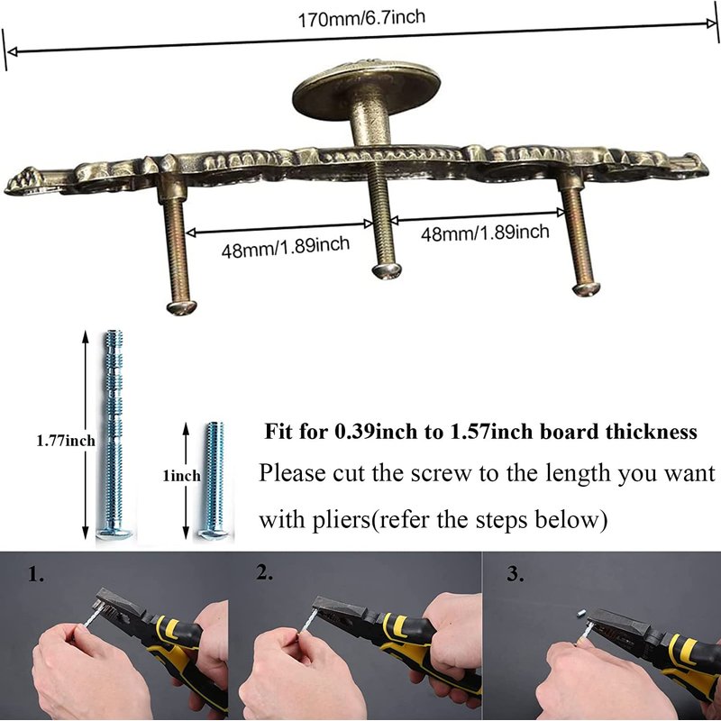 - 【2 Sizes Screws】Include 15pcs 1'' ,15pcs 1.77'' screws and 5 vintage drawer handles. For the 1.77'' screws, you can cut the screw to the length you want with pliers. Screws fit for most board thickness between 0.39'' to 1.57''
