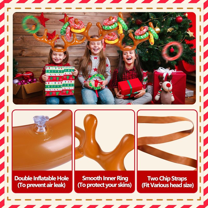 - Fun kids games for the family: Xmas ring toss game set includes 24 * Rings with 3 colors, 4 * Inflatable reindeer antler hats, 4 * Clown noses, 1 * Pump. Add fun to your Christmas party with this inflatable ring toss game.