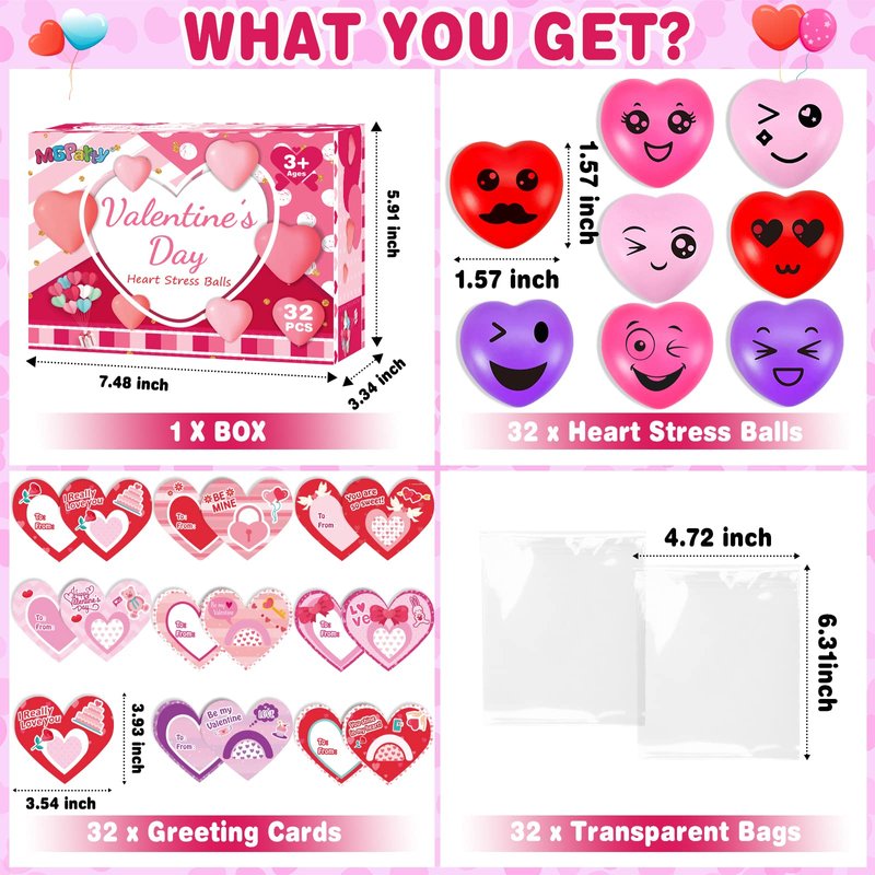 - Super Value Package: The Valentine Party Favor for kids includes 32 Heart Stress Balls, 32 cute Valentine's cards and 32 little bags. These are the perfect Valentine's Day gifts for kids!