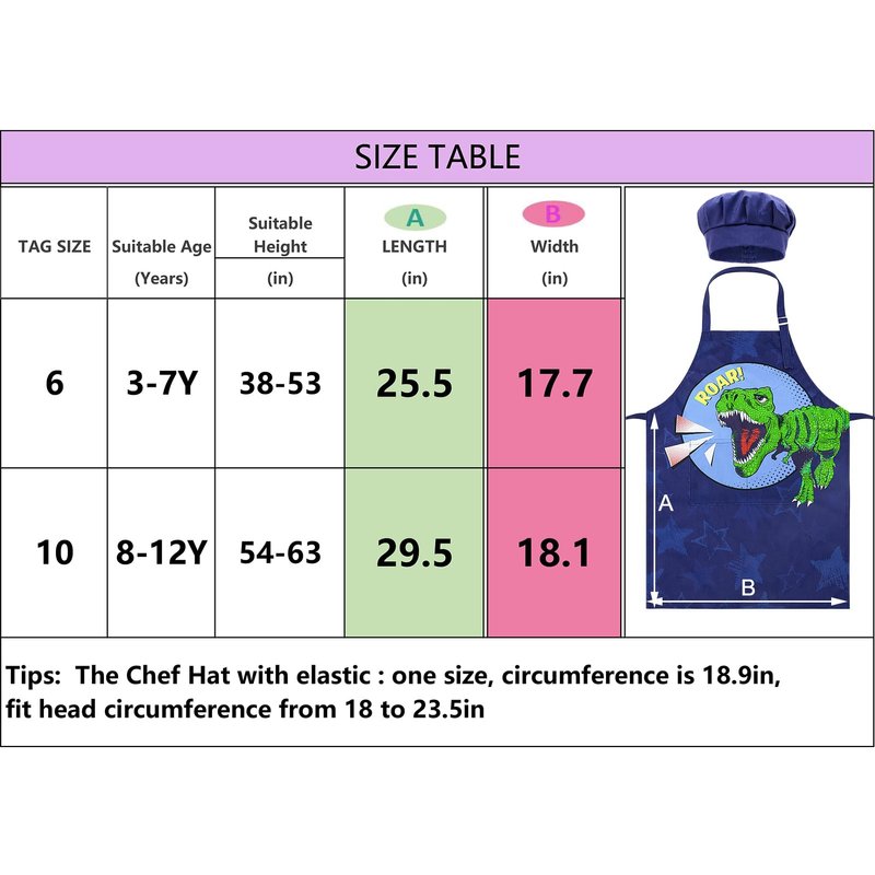 - 【Child Aprons Sizes】: 2 Sizes available: Small--25.5"X17.7"(LxW) (suggest for kids age 3-7 years); Large--25.9"X18.1"(LxW) (suggest for kids age 8-12 years). One size chef hat with elastic on back, comfortable to wear.
