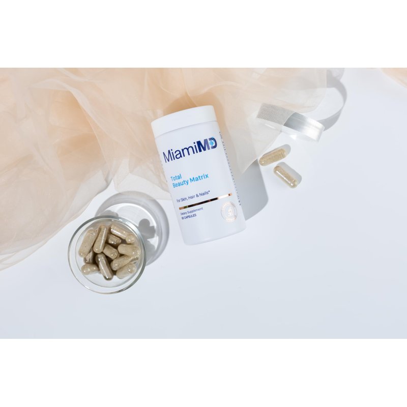 Total Beauty Matrix contains collagen and biotin supplements uniquely formulated to fight back against lost collagen, aging hormones and fading beauty. It can also help with wrinkles, fine lines, crow’s feet, crepey skin, thinning hair, and weak nails. Contains Hydrolyzed Collagen Peptides, Saw Palmetto, Lysine, Vitamin C, Biotin & Proprietary Mineral Complex. Hydrolyzed Collagen Peptides are especially good for women who want to restore collagen lost to menopause. Saw Palmetto can reduce levels of the aging hormone, DHT, which in turn helps increase estrogen levels and collagen production. Lysine helps build collagen for elasticity and firmness. Vitamin C (as ascorbic acid) helps distribute oxygen and boost collagen production for youthful skin. Biotin provides hydration and nourishment to bring tired, dull complexions back to life. Proprietary Mineral Complex contains natural minerals that help rebuild from the inside-out while protecting new tissue. Each bottle of MiamiMD’s Total Beauty Matrix includes 60 collagen peptides capsules. Simply take 2 capsules each morning with a glass of water. All MiamiMD products are Paraben Free, Fragrance Free, Cruelty Free, and BHA Free.