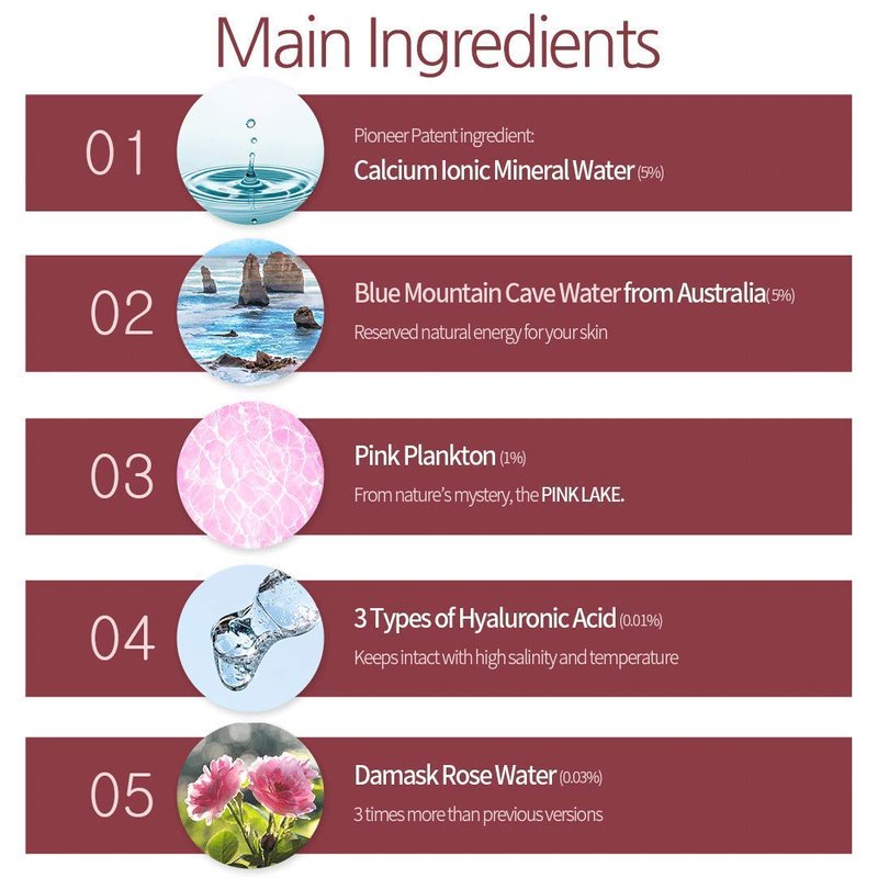 - Moisturizing and Luminous Season 2 Key Ingredients 01] Independently developed patented ingredient - Containing ion calcium mineral water 02] Contains Australian Blue Mountain Cave Water that retains the energy of nature 03] Embracing the mystery of Mother Nature, a pink lake. 'aka, with pink plankton 04] Contains triple hyaluronic acid that survives high salinity and temperature (0.01%)