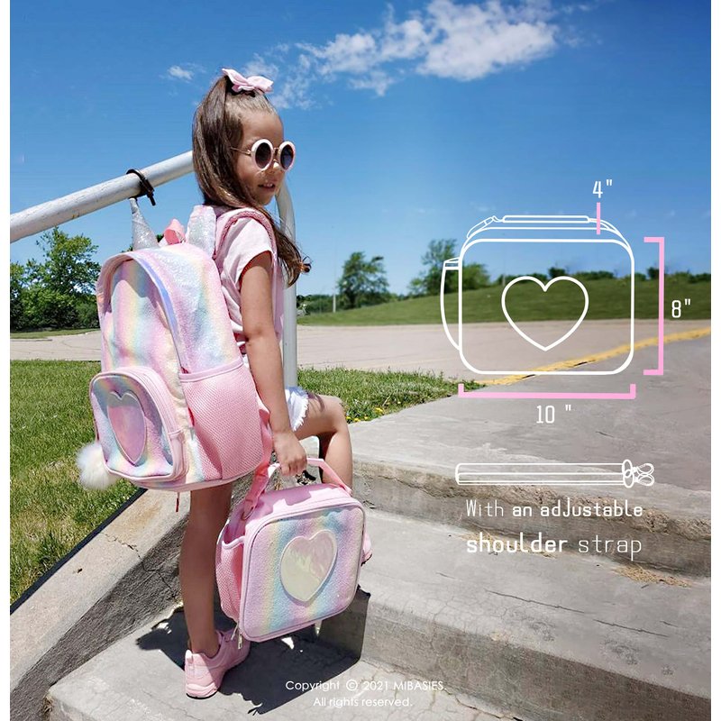 mibasies Girls Lunch Bag for Kids Insulated Lunch Box with Shoulder Strap and Bottle Holder, Glitter Rainbow