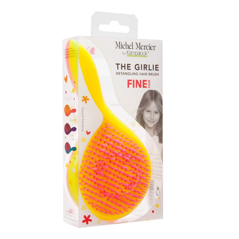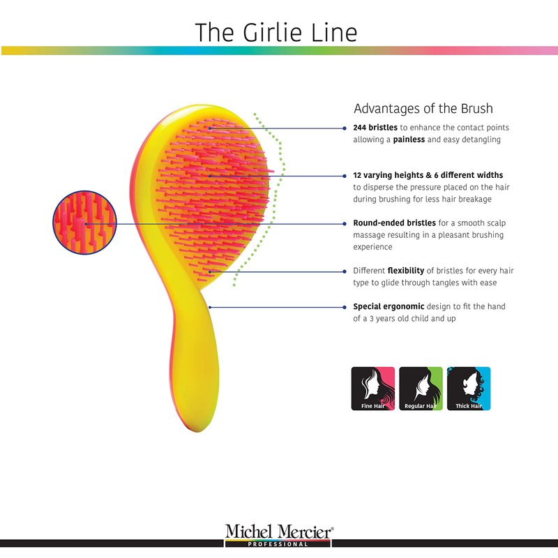 With the girlie brush, the girl can brush her own hair without pain.The brushes are available in three color-coded models for fine, normal and thick hair.The Michel Mercier detangling brush is a specially designed to remove knots and tangles from your wet or dry hair by brushing it. Easy, painless and ideal for children from age 3 up.