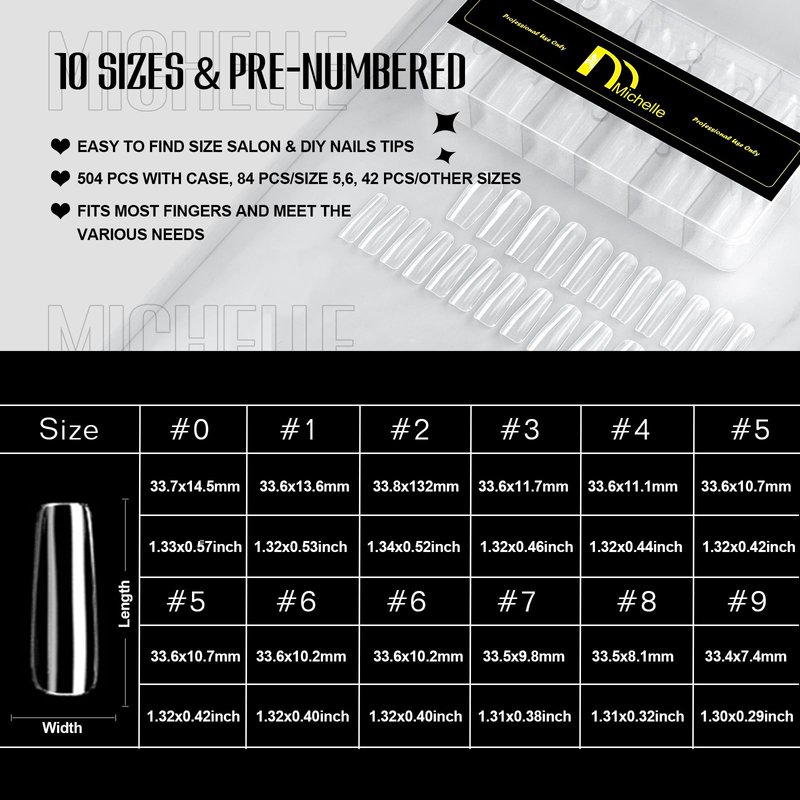 - ★Varied Size: Michelle's Professional nail extension set include 504pcs large square nail tips with 10 different sizes. Considering the actual use, we offer 84 pcs each size for size 5 and size 6, and 42 pcs each size for other sizes.