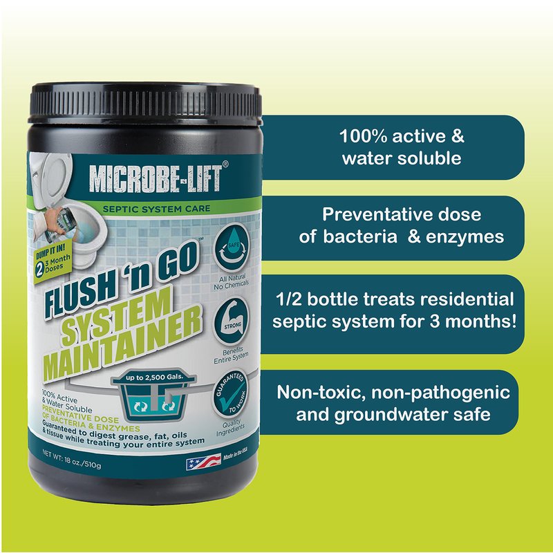 - 6 MONTHS OF TREATMENT - Just drop one dose of Microbe-Lift - System Maintain Powder into your toilet and flush! Then, watch the healthy bacteria and enzymes do its job. Contains two 3 months doses. ½ bottle treats residential septic systems for 3 months!