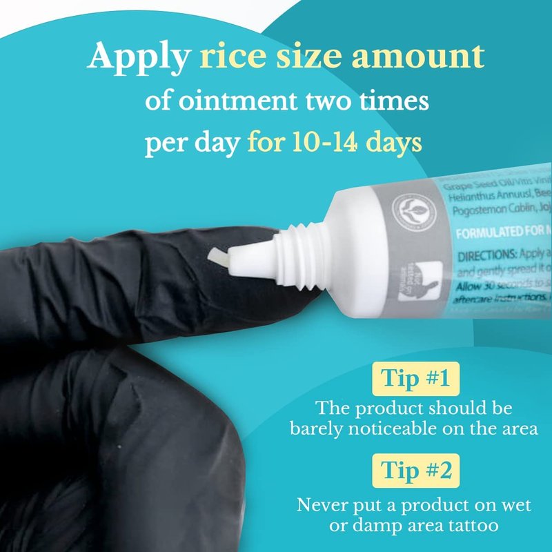 - HOW TO USE - Apply rice size amount of ointment two times per day for 10-14 days. The product should be barely noticeable on the area. Never put product on a wet or damp tattoo.
