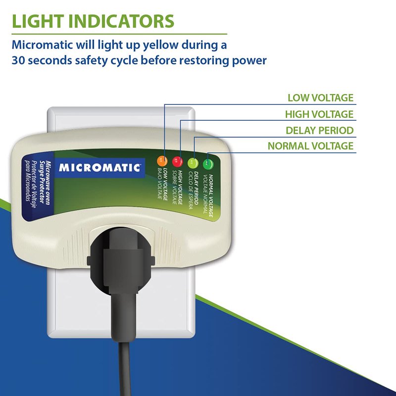 Electronic surge protector, specially designed to protect microwaves against lightning strikes and other power overload situations. Micromatic will automatically cut power to protect your microwave when voltage changes are detected. Please wait 3 minutes, before you plug in your appliance the first time you use this unit. Product Features: High and low voltage protection: When voltage exceeds safe range, Micromatic will automatically cut off the power to prevent the microwave being damaged. Light indicators: - The NORMAL VOLTAGE INDICATOR turns on when power supply is in the allowed voltage range. - The HIGH AND LOW VOLTAGE INDICATORS turn on if power outlet is not within the allowed voltage range. - DELAY PERIOD INDICATOR turns on when voltage suddenly exceeds the safe range, and power has been cut because of this, to protect the appliance. Auto Reconnect: when stable power is detected. Portable and convenient design: it is easy to install and sized to fit in confined spaces DO NOT CONNECT MORE THAN ONE APPLIANCE TO THE PROTECTOR