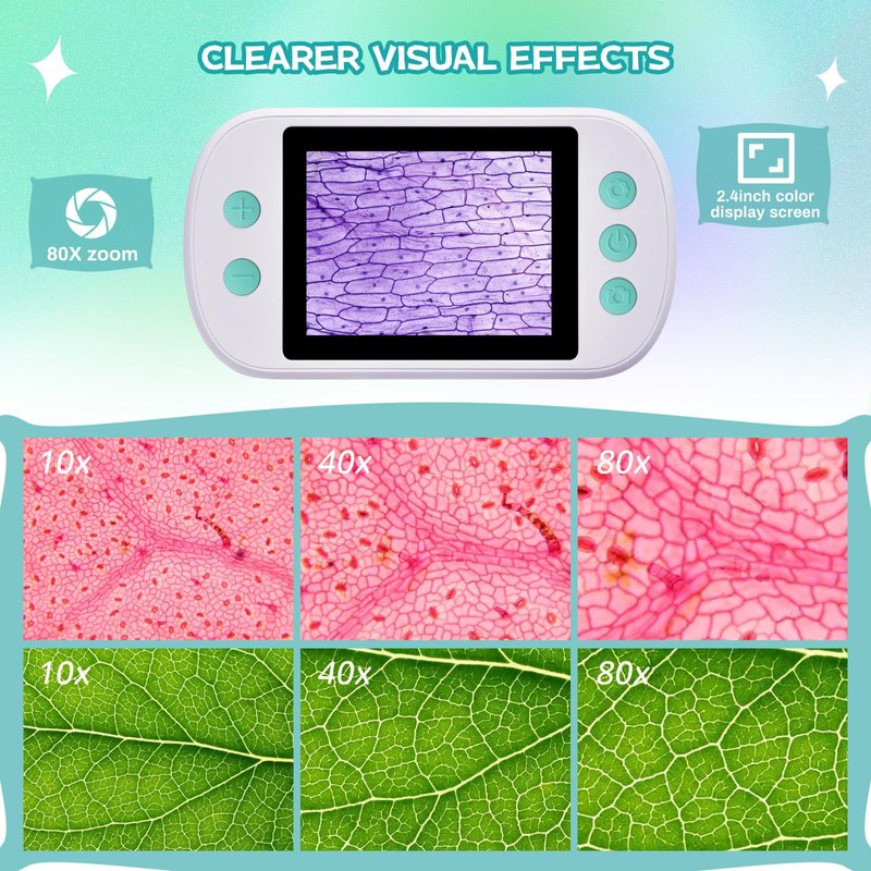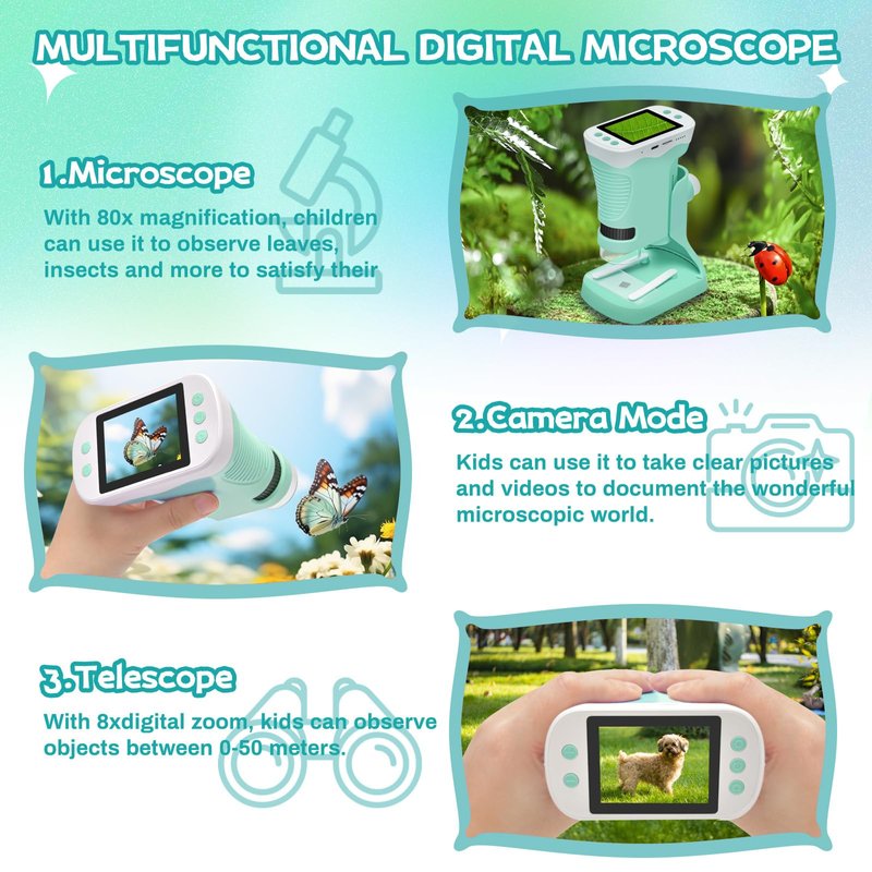 - ➤【3-In-1 Microscope For Kids】 This kids' science toy supports one-click photo and video capture and doubles as a mini telescope. Equipped with a detachable stand, it is highly portable and suitable for use in various locations such as the backyard, park, or during travel. It offers endless fun for children while enhancing their learning experience.