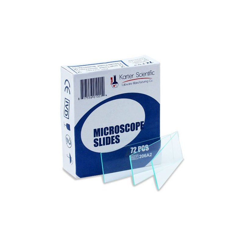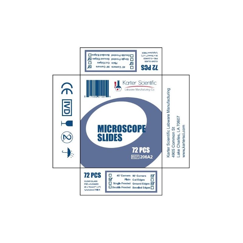 Made of high quality soda-lime glass, these microscope slides are plain, with ground edges and 90 degree corners. Ideal for use in the diagnosis and investigation of all types of specimens, slides have undergone an automatic cleaning process, which makes them ready for use upon arrival. Slides are supplied 72 per box. Karter Scientific is a registered trademark in United States of America. To maintain quality control, authorized permission is required in the resale of our products.