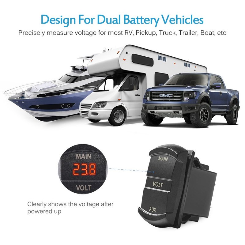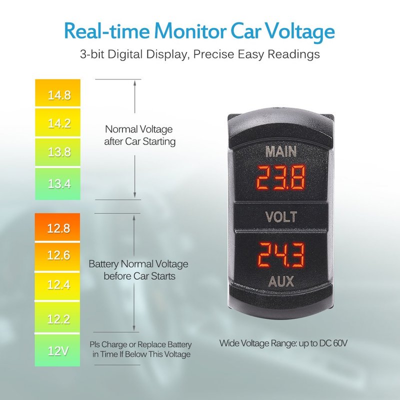 - MICTUNING [Exclusive] Switch-style Double Voltmeter, real time monitoring 2 battery packs of vehicles, remind you of charge or replacement in time, better avoid emergent dead battery at starting car engine!