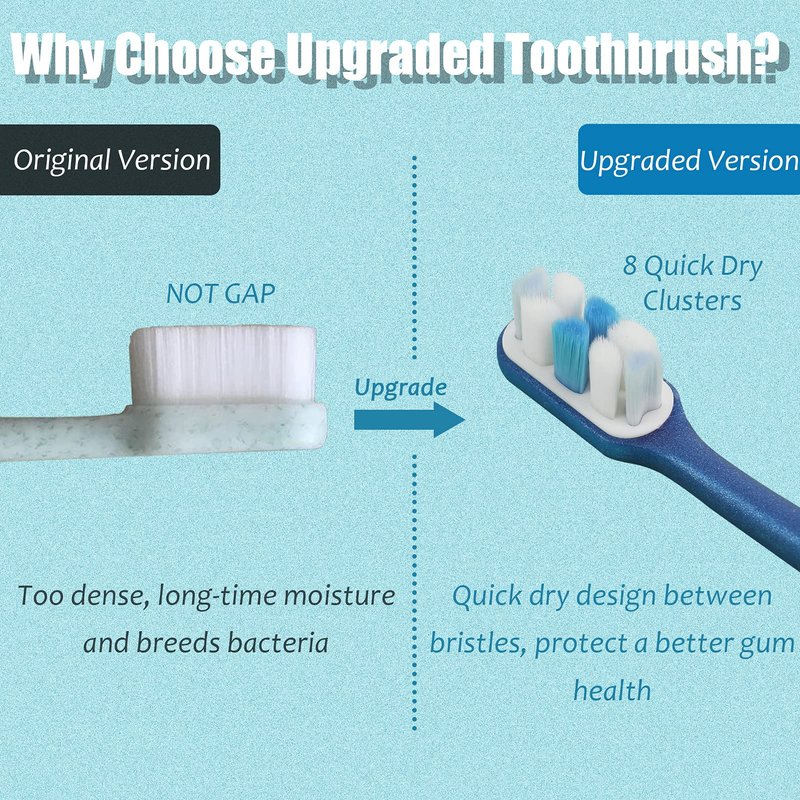 - 【8 Quick Dry Bristle Segments】Separating 10000 super dense bristles into 8 segments, this design enables 10000 bristles to dry out much faster than the foam sponge-like bristles and prevent things get trapped at the root which helps maintain the toothbrush clean. Also, this newly invented design makes bristles durable and not easy to splay out like others!