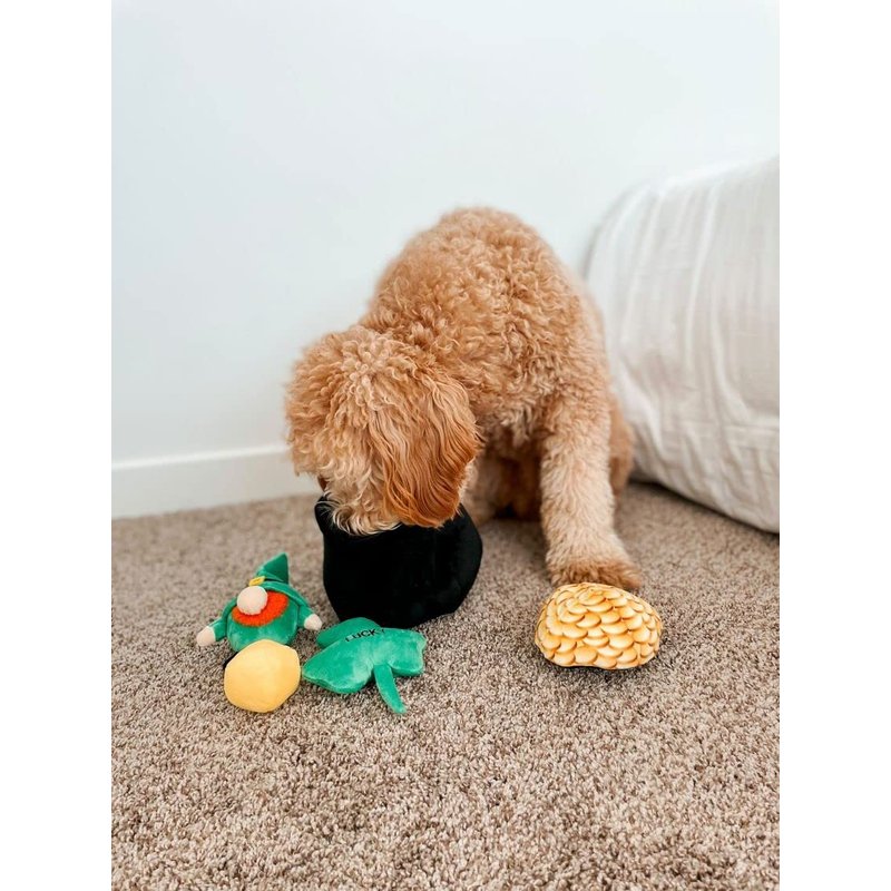 Interactive pet toy with 6 individual pieces. Each toy contains a squeaker. These are best for small-sized dogs. Includes a black pot, a plush shamrock, leprechaun, 2 pieces of gold, and a plush pile of gold for a topper. Put everything inside the pot and keep your dog busy while they work to get the items out. Your pup can get lucky by not only getting a pot of gold but also by catching the pesky leprechaun! Shamrock is 4" tall. Leprechaun is 5" tall. The gold piece is 2" in diameter.