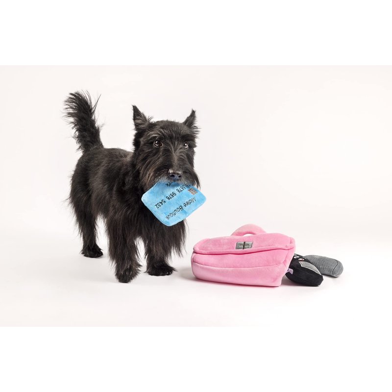 Adorable 9" long plush pink purse is a puzzle that hides three smaller toys, a credit card, comb, and phone. Since the toys need to be hunted out of a hole in the back of the purse, it works your pet's brain by locking onto their natural instincts and channeling it in a productive manner. For further entertainment and as a pleasant surprise to your pup, the smaller toys each make sounds. The phone and comb contain squeakers, but to mix it up, the credit card contains crinkle paper.