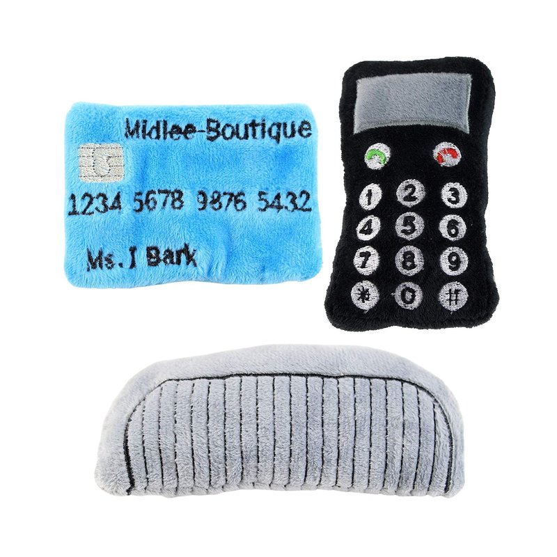- Phone and comb have squeakers, credit card has crinkle paper.
