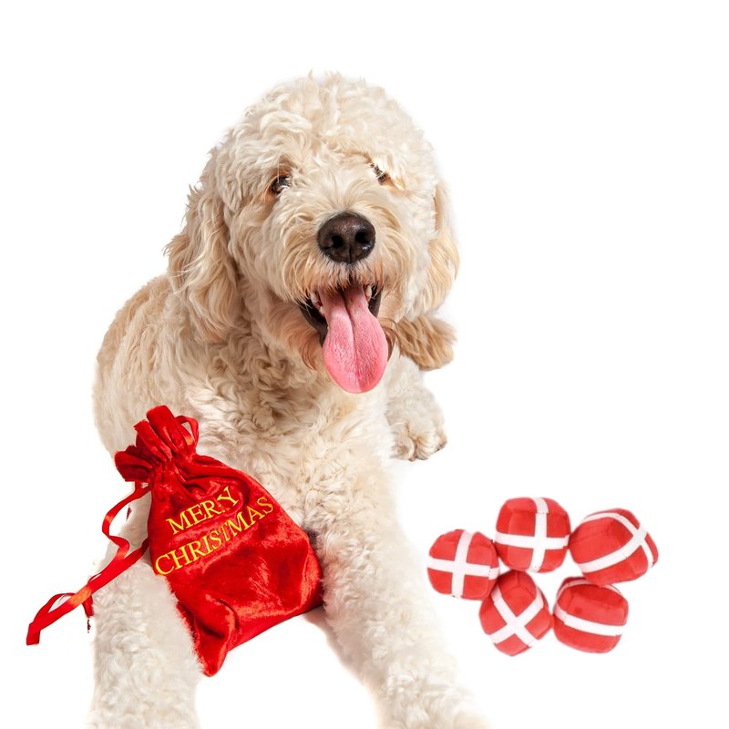 - Set of 5, 2.5" present toys in a red velvet Christmas bag. Best for small to medium sized dogs.