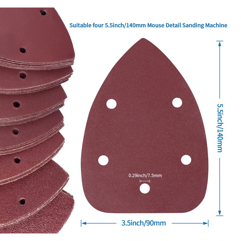 - 【Universal Compatibility】 The mouse sander sandpaper size is 140 * 90mm, pre-punched with 5 holes for dust extraction, suitable for 140mm detail sanders. Note: please clean the dust and replace the hook and loop sanding pad before use, and these palm sander sandpapers are not suitable for adhesive sticker sanding pad. You should add converter when it's applied to an electric drill.