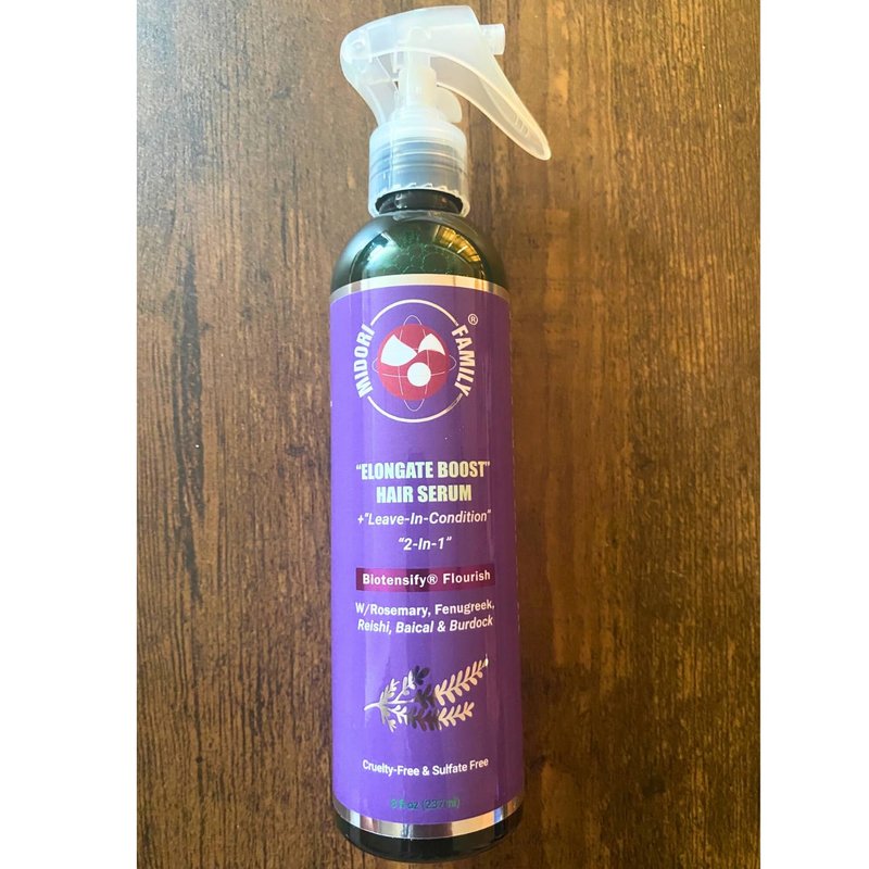 Midori Family Elongate boost hair-serum : This product works to encourage hair thickness, density and promote hair growth. It is an excellent hair serum great for thickening, thinning concerns, alopecia, excessive shedding, slow growth...and to accelerate or boost hair growth... This synergy of botanicals works on both root and hair strengthening...from root to top to encourage lengthening and growth. It has a mild conditioning effect suitable for the body of hair. This product should be applied to roots and hair at least 3 to 4 times a week at a minimum is required for best results.