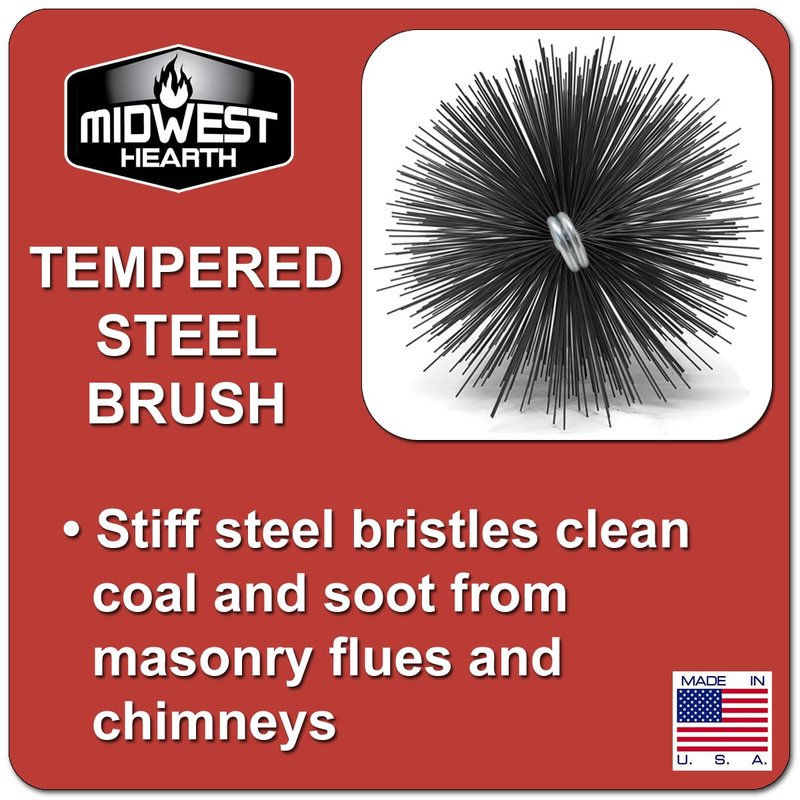 ☑ Chimneys should be cleaned at least once a year, and more often if you use your fireplace frequently. ☑ Midwest Hearth Wire Chimney Brushes are designed to be used with a masonry chimney flue (not a metal flue). ☑ Measure the inner diameter of your flue and order the same size brush: 6" Round or 8" Round. ☑ Our chimney brushes are professional quality and feature stiff tempered steel bristles and a heavy duty galvanized steel stem. ☑ The brush will have 1/4-Inch male pipe threads at the end that may be attached to extension rods. ☑ Midwest Hearth offers an 18-Foot fiberglass rod extension kit that is compatible with these brushes (sold separately).