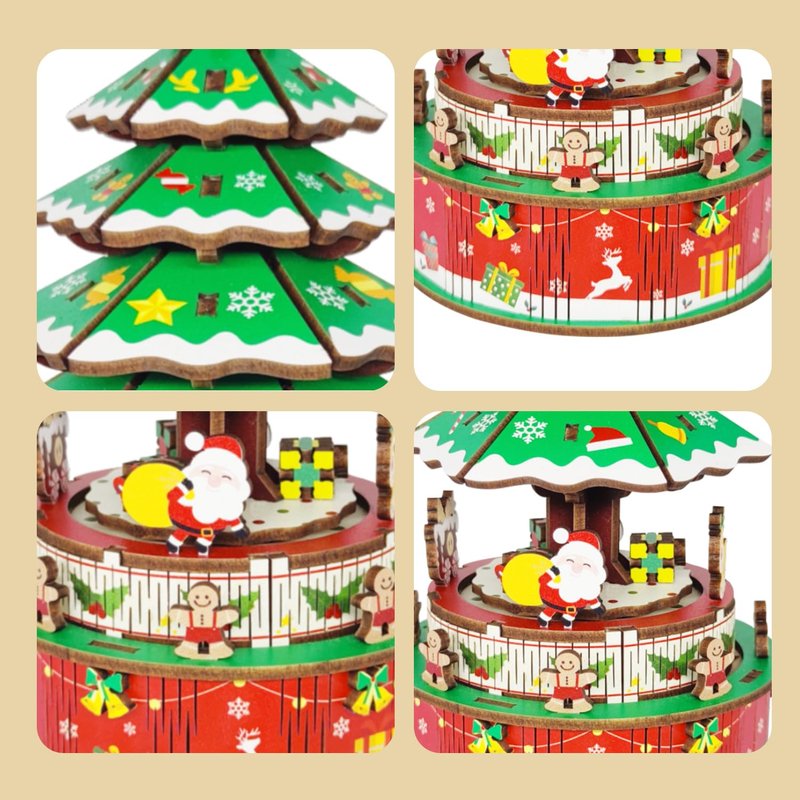 - wooden puzzle music box, colorful buildings, music playing and turning the Christmas tree, Santa Claus, interaction with animals, making it really spin, providing a wonderful intimate experience when children assemble it with their parents or friends.
