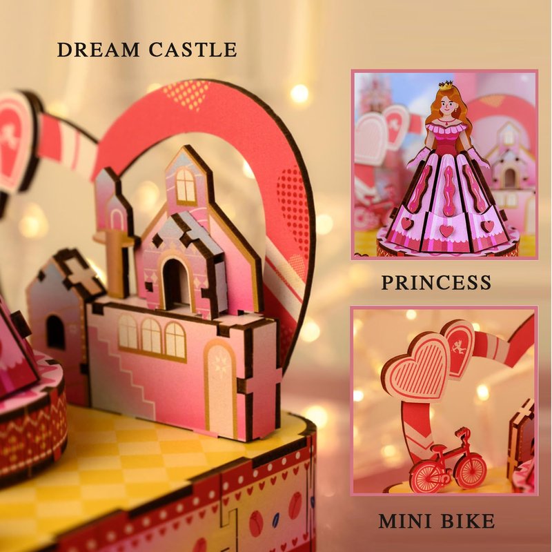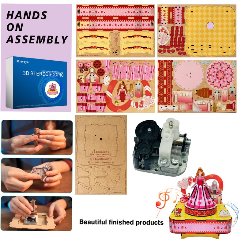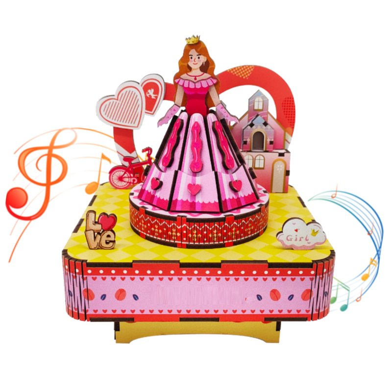 - Wooden music box is composed of 3D puzzle, after the assembly is completed, turn the mechanical spring at the bottom, the girl will rotate with the music.