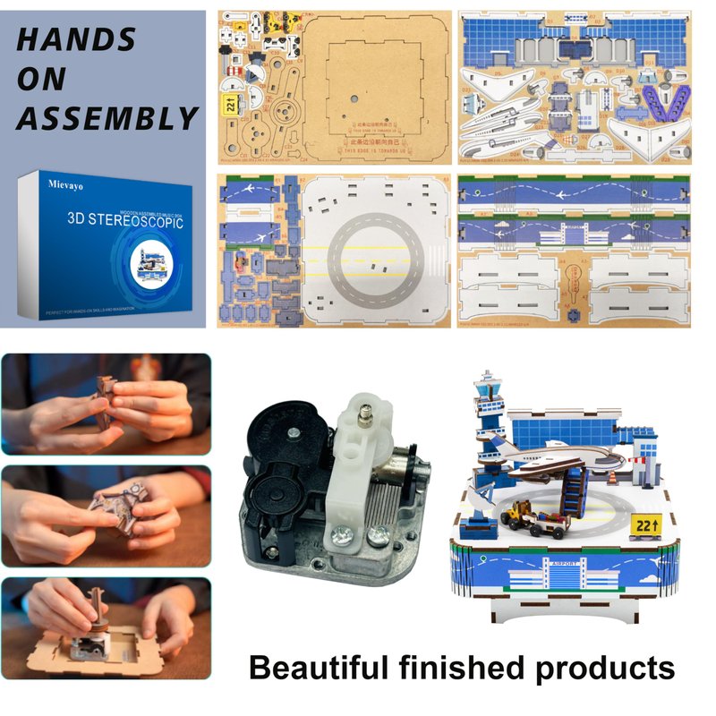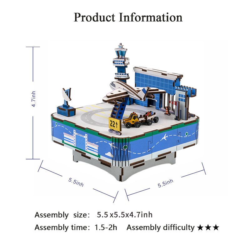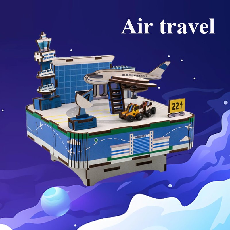 - 3D wooden music box, aviation model kit, gifts for kids. Once assembled, a mechanical spring at the bottom is turned, and the trailer begins to circle the plane to the music.
