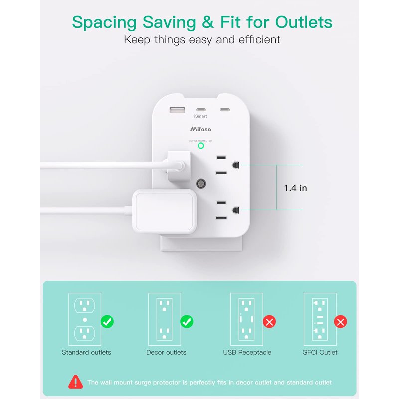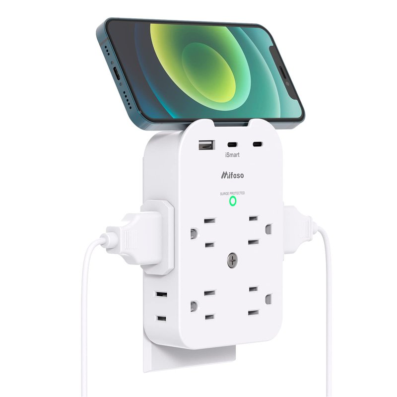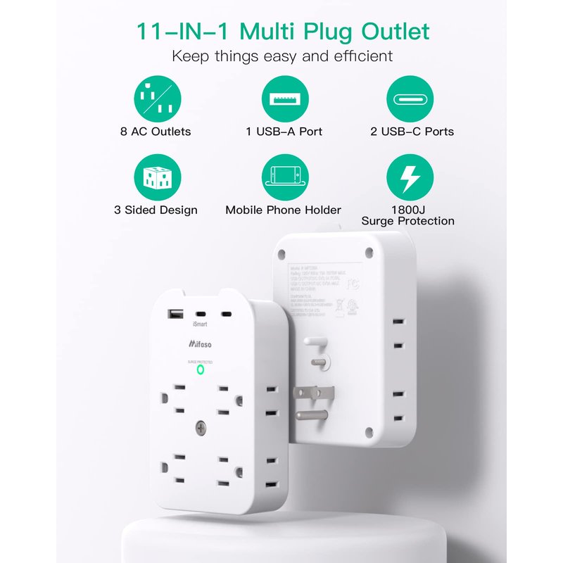 Mifaso Outlet Extender - Wall Surge Protector with 8 Outlets 3 USB 2 USB C, 1 USB A Multi Plug Outlet Splitter, Wall Mount Adapter with Top Phone Holder for Home, School, Office 1800 Joules