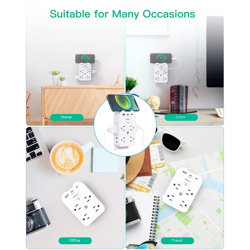 - Multifunctional USB Wall Outlet: 3 smart USB charging ports (2 USB C ) and 8 AC outlet Plugs with a built-in surge protector (1800 Joules). AC 100-240V normal working voltage range. It supports 11 electric devices simultaneously, like cell phones, iPad, laptops, lamps, cameras, and many other devices.