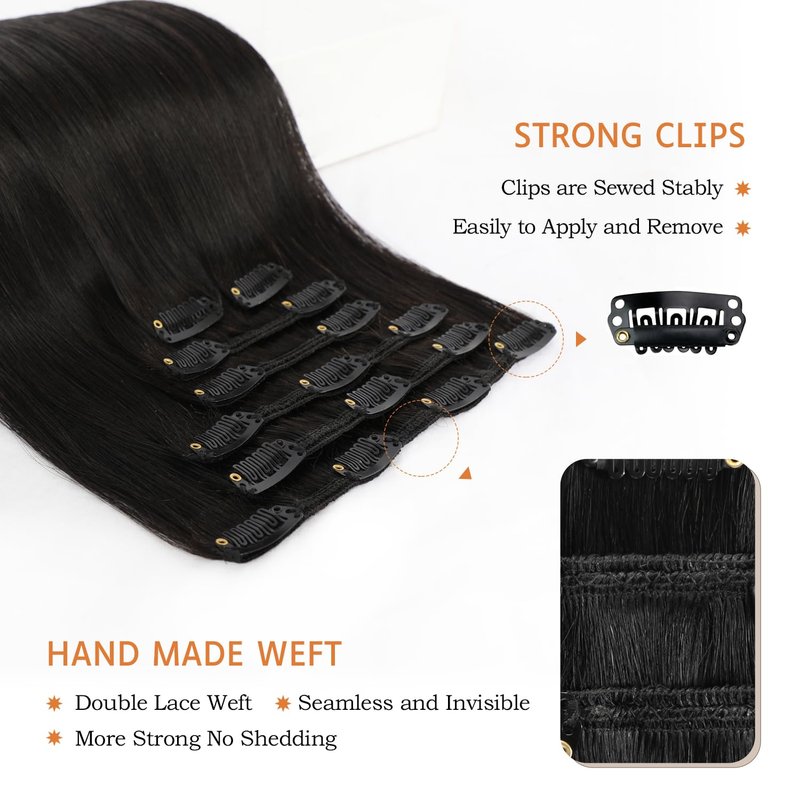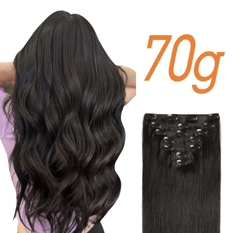 - 💕Hair Extensions Specifications :Our Clip in Hair Extensions Real Human Hair Includes 1 set of Natural black 14 inch 70gram Clip in Extensions with 7pc Wefts【1 x 4-clip weft (8"),1 x 3-clip weft(7"),1 x 3-clip weft(6"),2 x 2- clip weft(4"), 2 x 2- clip weft(2")】2 Hair Clamps, 2 Hair Ties, 2 Hair Clips,1 Pair of Eyelashes,1 Hair Extension Storage Bag and 1 Pack of Black Hair Tinsel Extensions all Packed in a Nice Cloth Bag.