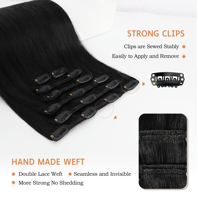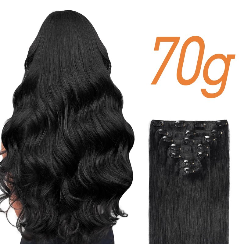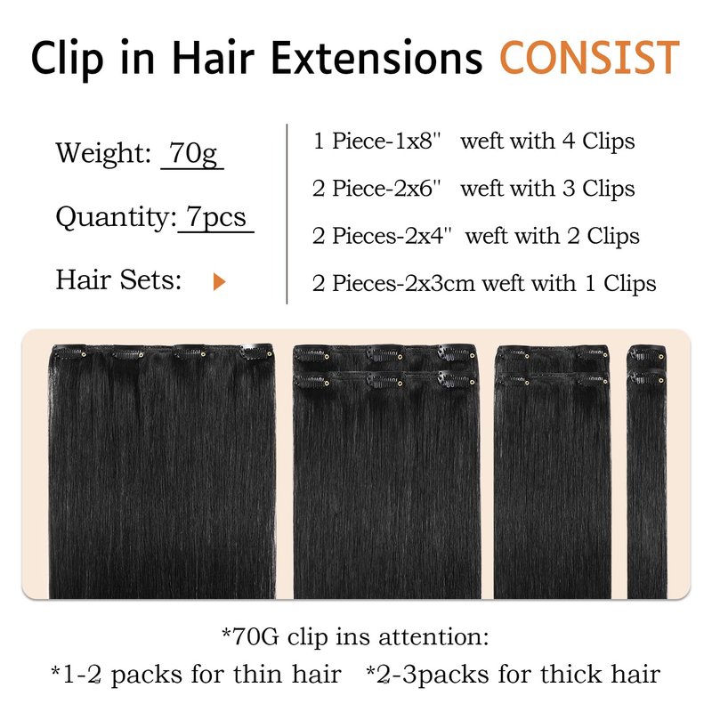 - 💕Hair Extensions Specifications :Our Clip in Hair Extensions Real Human Hair Includes 1 set of Jet Black 16 inch 70gram Clip in Extensions with 7pc Wefts【1 x 4-clip weft (8"),1 x 3-clip weft(7"),1 x 3-clip weft(6"),2 x 2- clip weft(4"), 2 x 2- clip weft(2")】2 Hair Clamps, 2 Hair Ties, 2 Hair Clips,1 Pair of Eyelashes,1 Hair Extension Storage Bag and 1 Pack of Black Hair Tinsel Extensions all Packed in a Nice Cloth Bag.