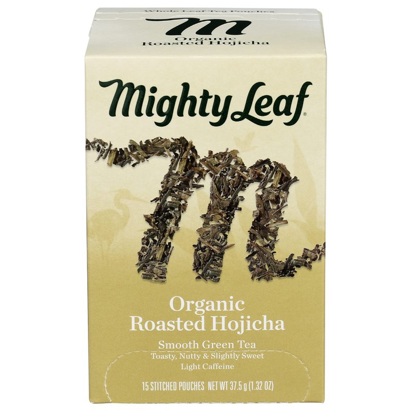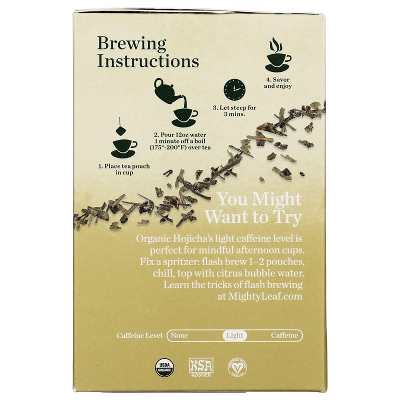 Toasty, nutty & slightly sweet. USDA Organic. Certified vegan. vegan.org. Certified organic by QAI. Light caffeine. Whole leaf tea pouches. Caffeine Level: Light. Different From the Start. We seek out the most vivid teas, flowers, and fruits, from farmers as particular as we are. Keep leaves whole, avoiding dust and fannings, so no nuance gets lost. Blend artfully, so we share with you exactly what we mean to. Organic Roasted Hojicha. This unusual style of green tea is a traditional type from Japan. Green Bancha tea leaves are meticulously roasted to golden-brown color in the cup. MightyLeaf.com. Learn the tricks of flash brewing at MightyLeaf.com. Want to talk tea? 800.999.2132.