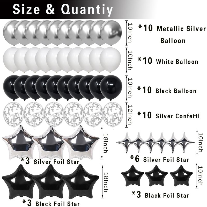 - 【26 Birthday Decoration Kit Includes】Black and white birthdaybanner *1; 10"Black White Silver latex balloons *30; Silver confetti balloons *6; 18"aluminum star balloons *6; 10"black star balloons *3; 10" silver four-pointed star *6; Black birthday cake topper *1; Black birthday foil number balloons 26; Black hanging swirls *6, Black, white silver star streamers garland *1,. Balloon arch strip *1.