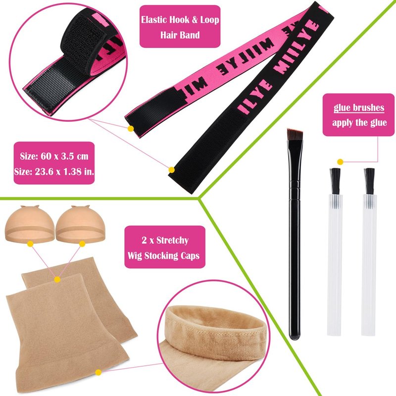 MIILYE Clear Wig Glue Pack, 100ml/ 3.4OZ Waterproof| Invisible Toupee Hair Bonding Glue, Strong Hold Acrylic Adhesive for Front Lace Wig, Pack of Lace Glue with Lace Melting Band, Brush and Wig Caps