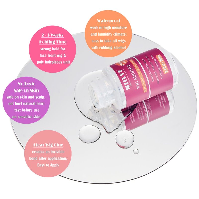 - Waterproof and Invisible hair bonding glue is clear color, you can easily get an invisible and strong bonding after the lace glue cure, MIILYE clear wig glue enables to create a natural look for all lace/ poly hair systems; even if you have oily skin and scalps, heavy perspiration, or hair wash (as long as not scrubbing or pulling at it) or living in high moisture and humidity, our waterproof lace glue can ensure your hair remain in place;